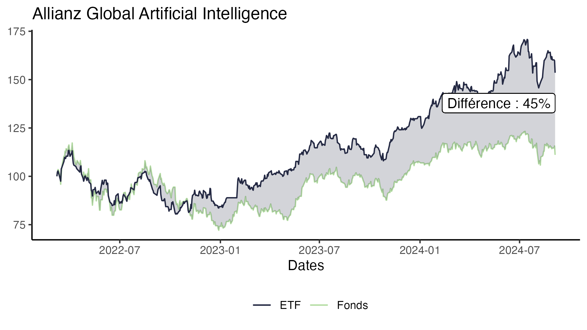 Pour rappel, notre méthodologie est naïve et elle présente l’évolution dans le temps des performances du fonds (sa valeur nette de rachat) comparée à la performance d’un produit indiciel répliquant l’indice de référence du fonds (ici noté ETF).