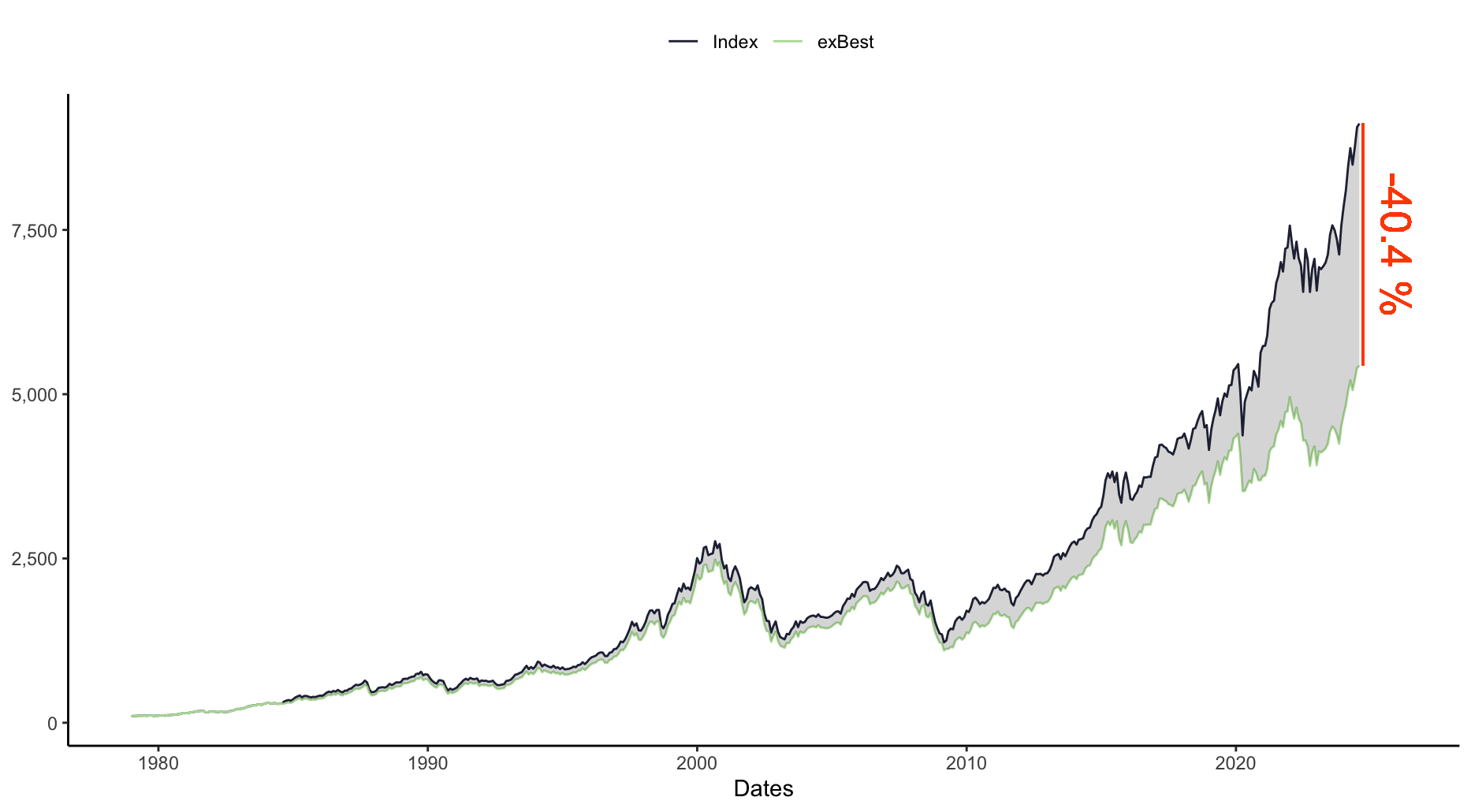 Le graphique ci-dessus illustre un fait saisissant : si nous ne sommes pas investis durant les 5 meilleurs mois, nous subissons un manque à gagner de 40%. Concrètement, il s’agit de ne pas être exposé aux marchés pendant moins de 1% du temps (5 mois sur 548) et pourtant, le montant final de votre épargne se voit amputé de plus de 40% de sa valeur. La performance brute annualisée passe alors de 10,4% à 9,1% par an.