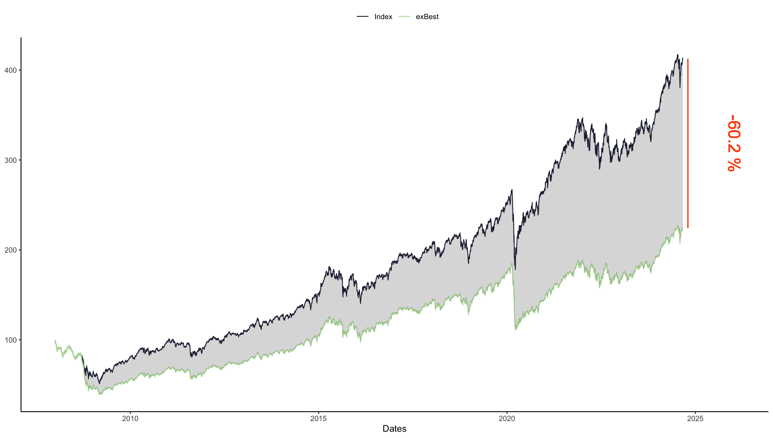 En d’autres termes, si vous n’êtes pas investi durant les 10 meilleurs jours, parmi les 4 350 que contient notre échantillon (soit 0,2% du temps), la performance annualisée de votre placement sur la durée chute de 8,6% à 4,8%, soit une différence de -3,8% par an.