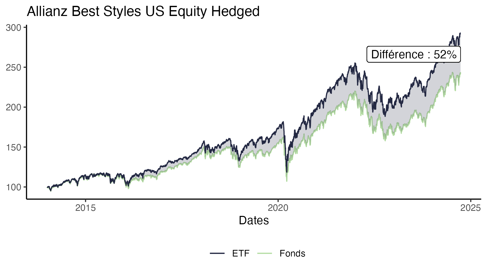 L’écart de performance est de 52% en faveur de l’ETF, avec un profil de risque comparable caractérisé par des variations quotidiennes similaires.