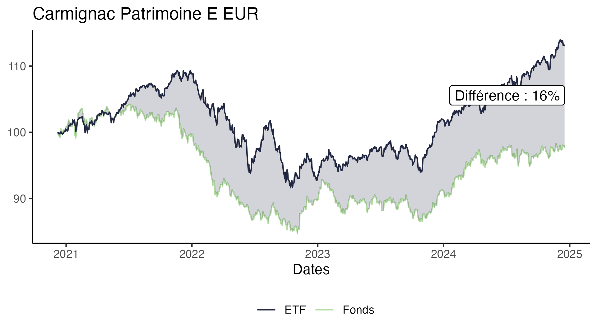 Pour rappel, notre méthodologie est naïve et elle présente l’évolution dans le temps des performances du fonds (sa valeur nette de rachat) comparée à la performance d’un produit indiciel répliquant l’indice de référence du fonds (ici noté ETF).