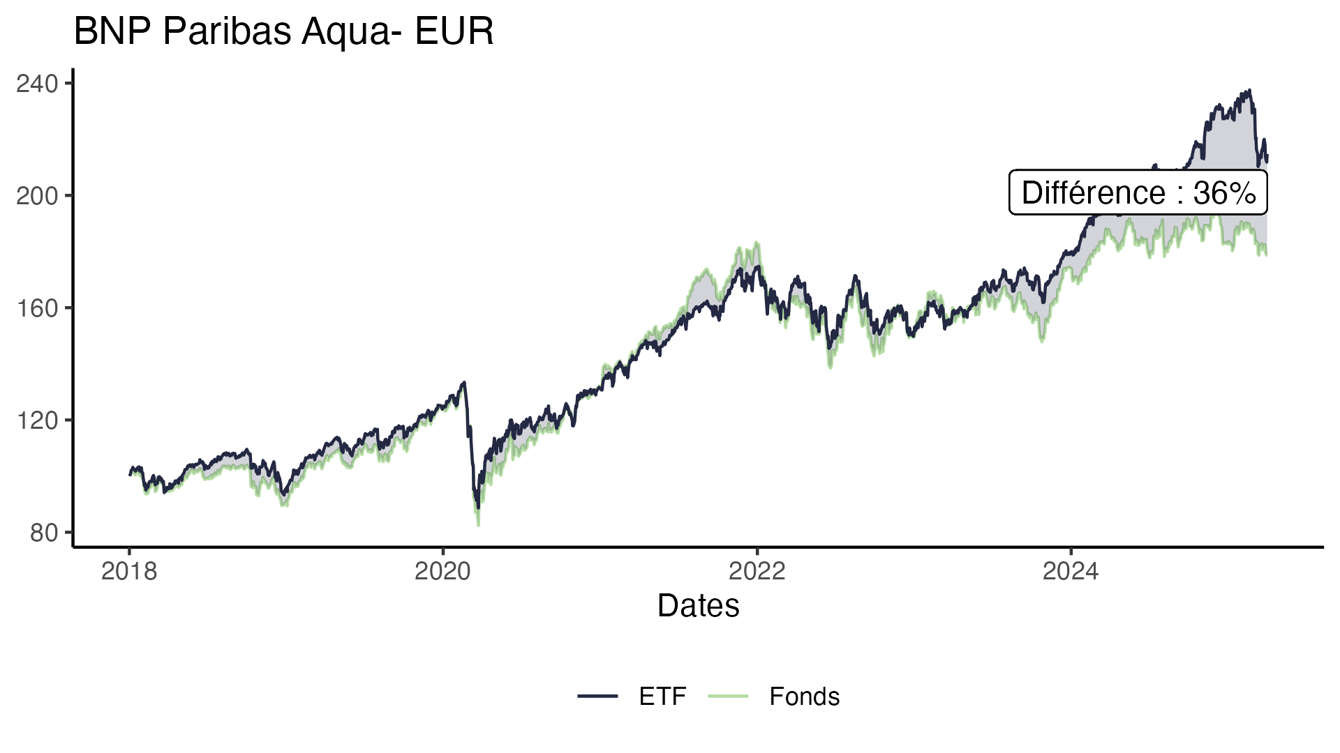 L’écart de performance est de 36% en faveur de l’ETF, avec un profil de risque comparable caractérisé par des variations quotidiennes similaires.